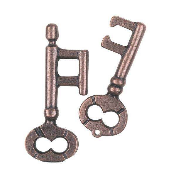 Dwa klucze... niczym od starej babcinej szafy, a może od sejfu z wielkim skarbem? Jak jednak sprawdzić ich zastosowanie, gdy klucze wydają się być trwale połączone i pozornie nie ma sposobu, aby je rozłączyć! Pozory mylą, gdyż jak przystało na jedną z najpopularniejszych szalonych łamigłówek XIX wieku, klucze dają się jednak rozdzielić!