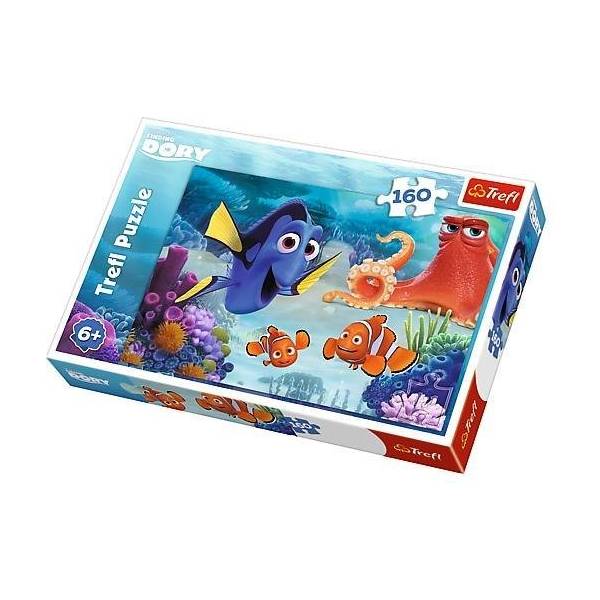 Puzzle 160 elementów z bohaterami filmu "Gdzie jest Dory?". Po ułożeniu powstanie obrazek o wymiarach 41x27,8 cm. Wysoką jakość, nasycenie kolorów i bezpieczeństwo układania zapewnia kalandrowany papier odbijający światło i wykorzystanie materiałów ekologicznych.
