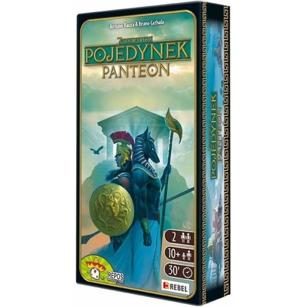Dodatek Panteon wprowadza antycznych bogów do gry "7 Cudów Świata: Pojedynek". Teraz gracze mogą ubiegać się o przychylność bóstw z pięciu różnych kręgów kulturowych i skłonić je wszystkie do roztaczania swojej opieki nad ich miastem. Z pewnością pomoże w tym budowa bogatej świątyni ku czci wybranego patrona lub patronki albo poświęcenie im jednego z dwóch nowych Cudów Świata dostępnych w dodatku.